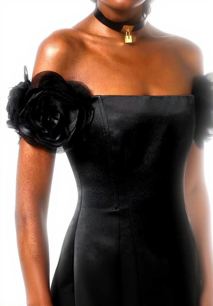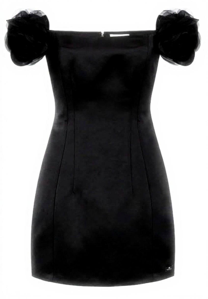Questo abito di Elisabetta Franchi è realizzato in duchesse di poliestere, caratterizzato da fiori applicati che aggiungono un tocco romantico e distintivo. La finitura nera lo rende versatile e adatto a diverse occasioni, con una vestibilità che esalta la silhouette femminile.