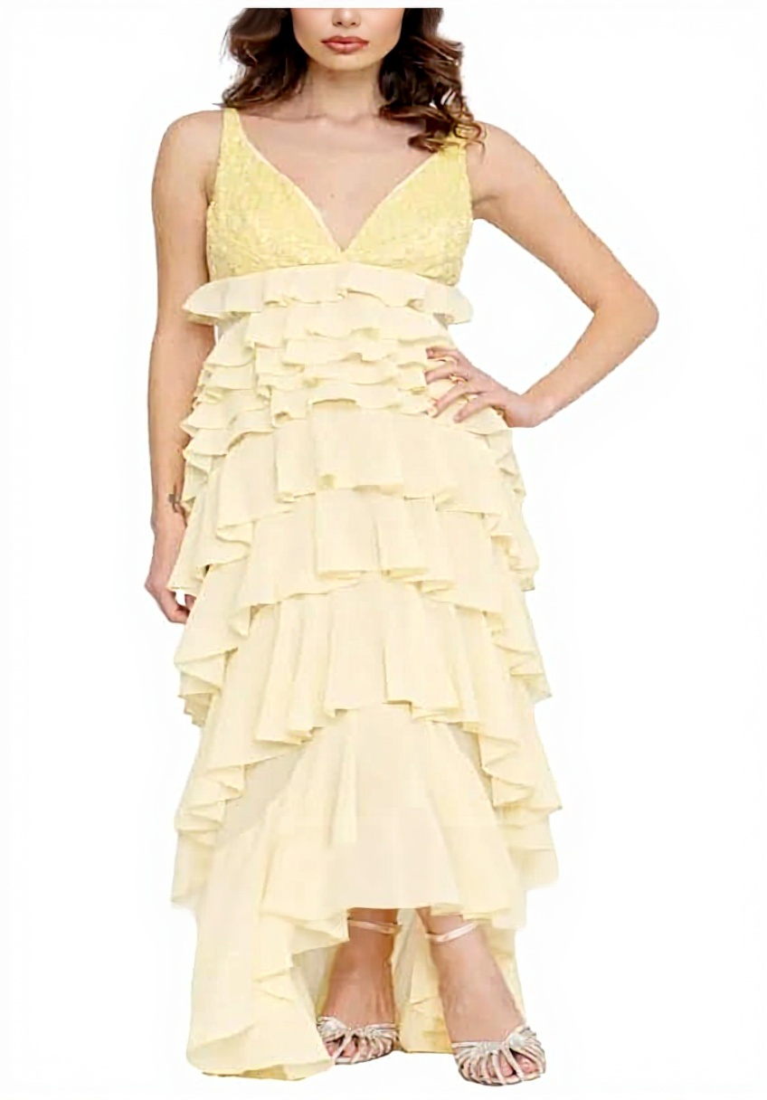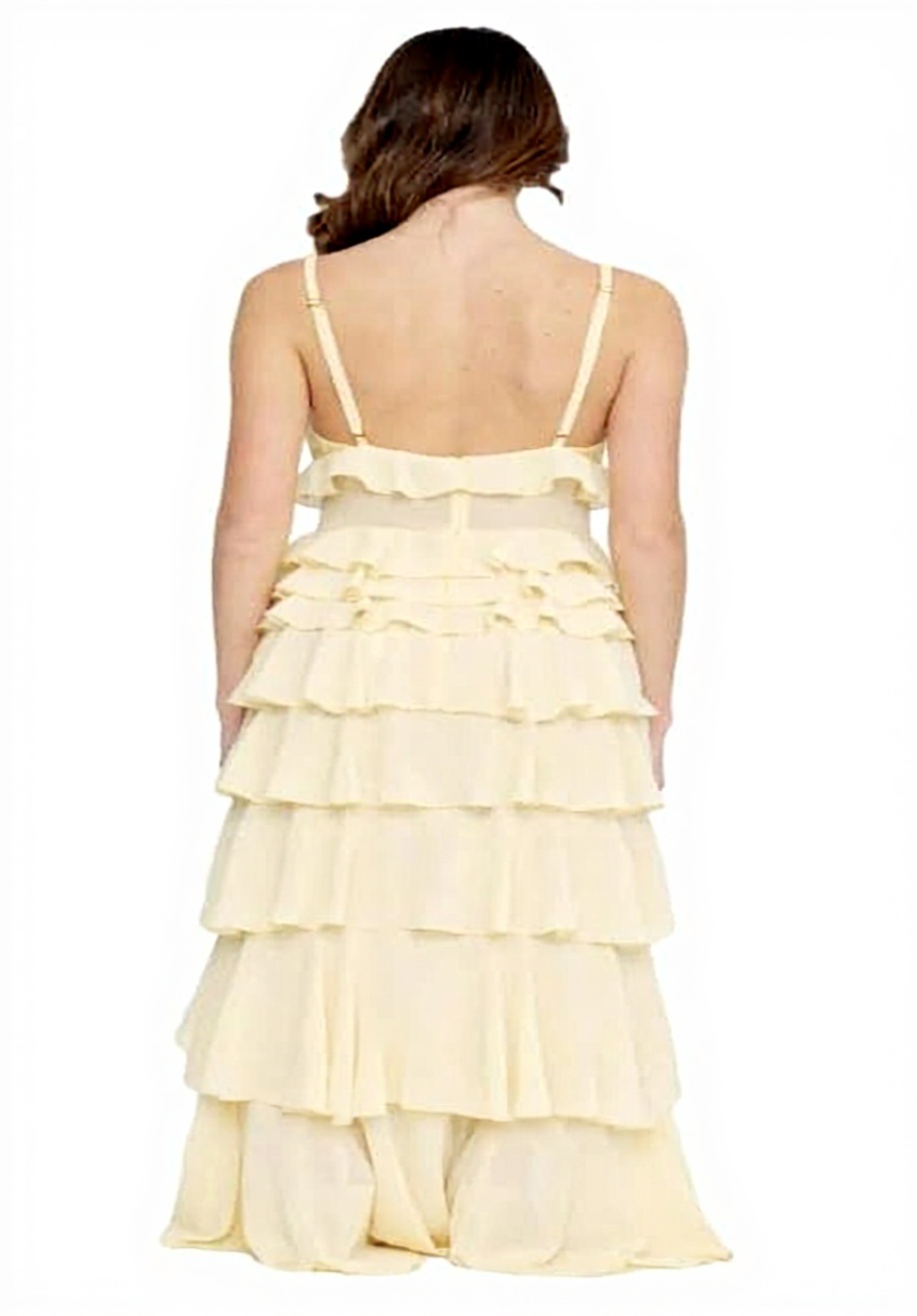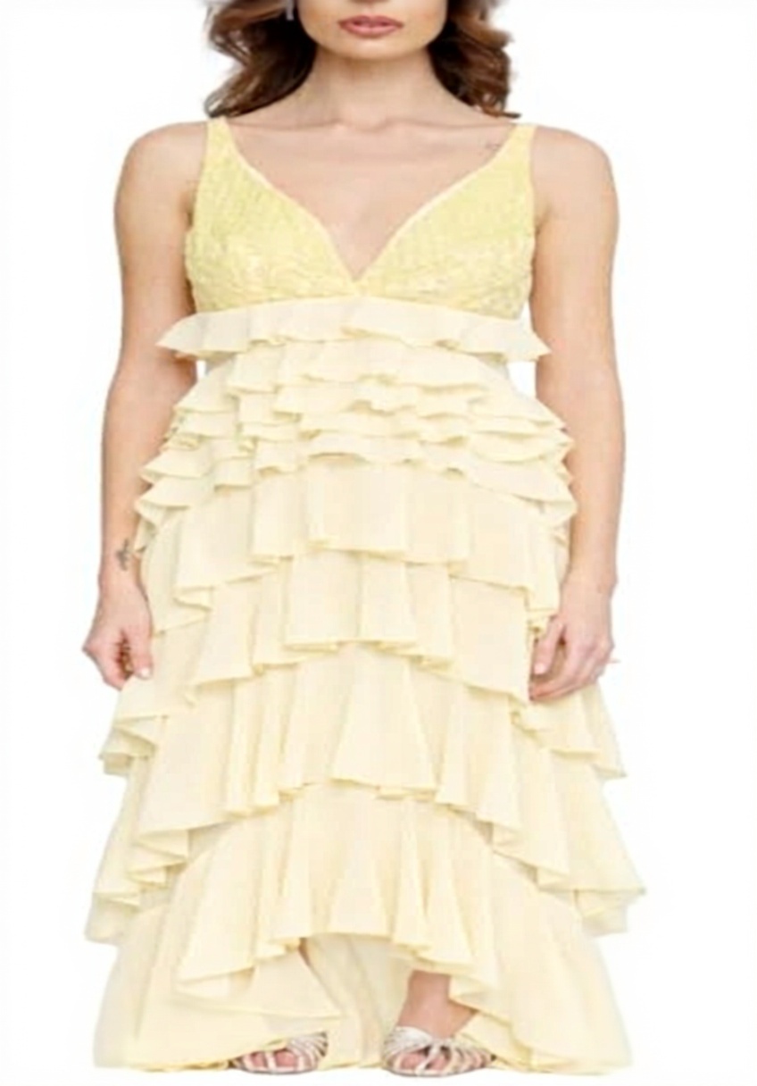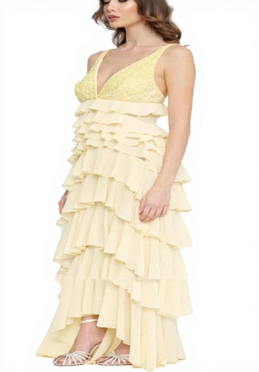 L’abito è senza maniche, una scelta che lo rende fresco e adatto a diverse stagioni, specialmente quando si vuole evitare una sensazione di costrizione. La georgette, con la sua consistenza sottile, si adagia delicatamente sul corpo, donando un effetto fluido che segue i movimenti. Le balze in giallo lemonade aggiungono un dettaglio visivo senza appesantire il design, creando un contrasto piacevole che cattura la luce. Nella pratica, si nota come il tessuto non si stropicci facilmente, un vantaggio per chi è sempre in movimento, anche se la mancanza di maniche potrebbe richiedere una giacca o uno scialle in ambienti più freschi.